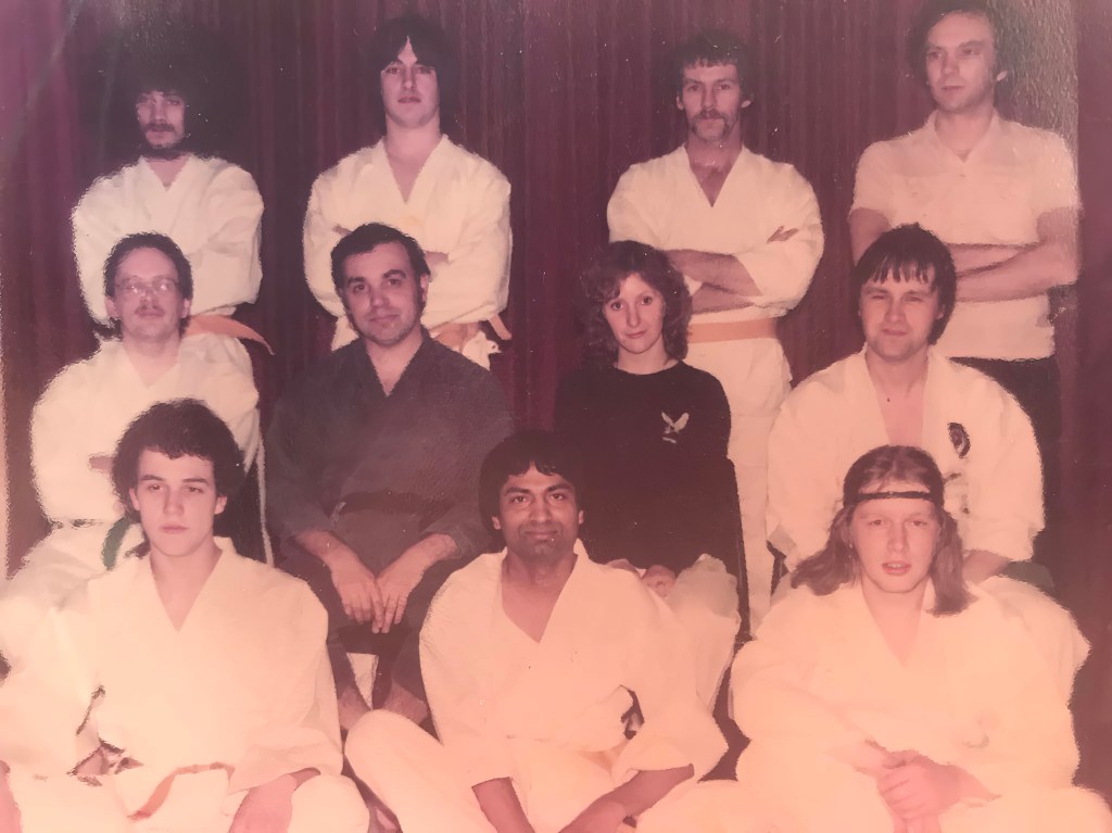 I am standing next to Martin, Sean is next to me, and Mark Harrison is behind David Frost. Tony Choules is next to David Frost. Mike Edwards, the first of the club’s black belts, is next to Tony. Peter Daniels is behind Martin